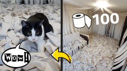 Watch as this kitty goes wild in a toilet paper fantasy! What a dream for him! Check it out above!